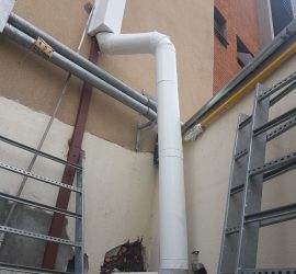 Tubulação de descarga dos gases da Turbina a gás bialbero T200D instalada no Laboratório de Máquinas térmicas na Universidade Mackenzie . (tubulação em aço inoxidável com revestimento de manta térmica de fibra cerâmica).